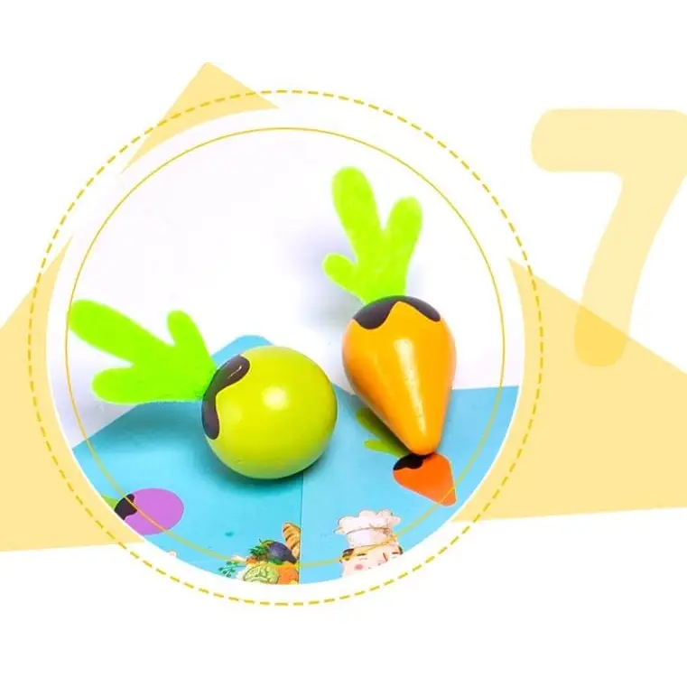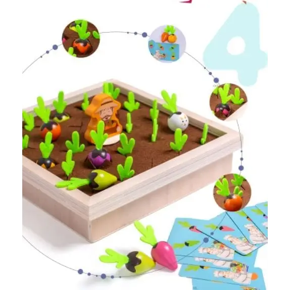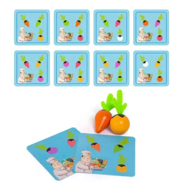 A Horta Educativa Montessori também acompanha 8 cartas, para brincar de colher os alimentos para o cozinheiro. E também pode ser usada como jogo da memória, como mais uma forma de brincadeira.